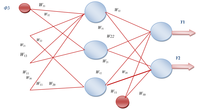 where the dimension of the vector inputs is: nφ φ neural network; nh-the number of neurons in the hidden layer; θ-vector of the configurable parameters of the neural network, which includes weights and neuron-by offset (wji, Wij); fj(x)-activation function for the hidden layer neurons; Fi(x)-activation function neuron in the output layer.
