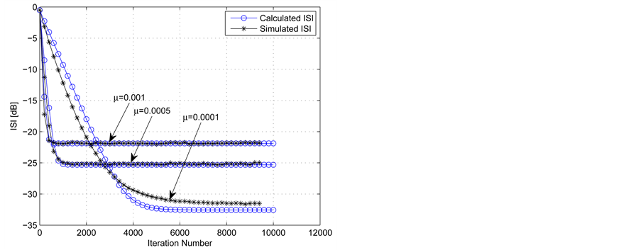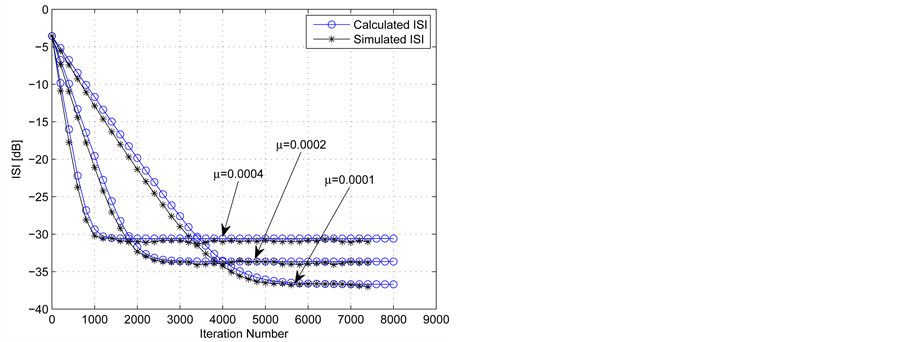 Figure 10. A comparison between the simulated and calculated ISI for the QPSK source input going through channel5 for different step-size values. The averaged results were obtained in 100 Monte Carlo trials. The equalizer’s tap length was set to 13 and the