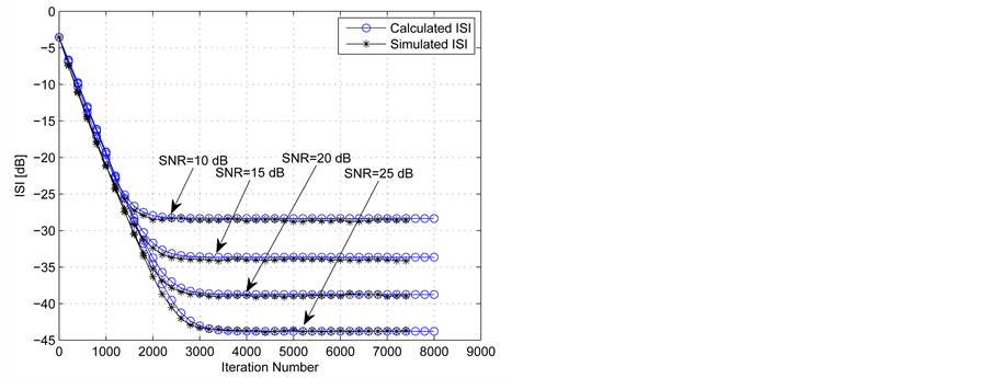 Figure 2. A comparison between the simulated and calculated ISI for the 16QAM source input going through channel1 for different SNR values. The averaged results were obtained in 100 Monte Carlo trials. The equalizer’s tap length and step-size parameter were set to 27 and 0.0002 respectively.