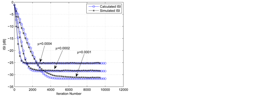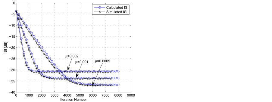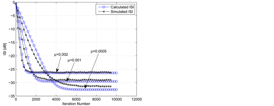 Figure 3. A comparison between the simulated and calculated ISI for the 16QAM source input going through channel1 for different step-size values. The averaged results were obtained in 100 Monte Carlo trials. The equalizer’s tap length was set to 27 and the