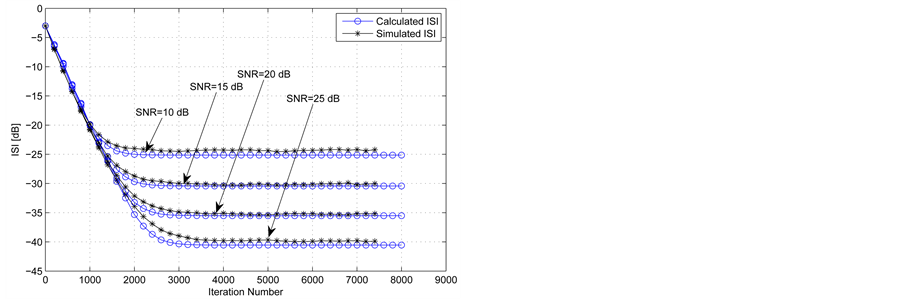 Please note that according to [11] , Channel1 is a telephone channel. In addition, Channel2-Channel4 are variations of Channel1 in order to get different values for the initial ISI. In the following we denote the ISI as a function of time (4) as the “Calculated ISI” and the “Simulated ISI” as the ISI as a function of time obtained via the simulation. Figures 2-13 show the ISI as a function of the iteration number (time) calculated according to (4) compared with the simulated results for six different channels, two different input constellations, various equalizer’s tap-length, various values for the SNR and step-size parameter. According to Figures 2-13, a high correlation is observed between the simulated and calculated (according to (4)) results. It should be pointed out that there might be cases with the use of lower values for the step-size parameter where the ISI curve can not be approximated with an exponential model having a single time constant (Figure 7, Figures 11-13). But, if a higher step-size parameter is used in the adaptation mechanism instead of the lower one, the resulting ISI fits the exponential model having a single time constant (Figure 7, Figures 11-13). In practical cases, the value for the step-size parameter is chosen in such a way that a fast convergence time is obtained with a residual ISI that still