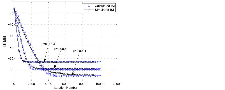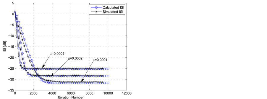 Figure 11. A comparison between the simulated and calculated ISI for the QPSK source input going through channel4 for different step-size values. The averaged results were obtained in 100 Monte Carlo trials. The equalizer’s tap length was set to 121 and the