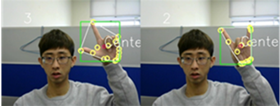 The proposed method is implemented by student-level programming with the aid of Open CV functions in Python, Windows 10 and Intel Core i7-6700 CPU. In our experiments, 400 video sequences are collected for ten hand postures. There are 40 sequences for each hand posture that a half of them are randomly selected as training set, and the remaining ones are treated as the testing set for the recognition examination. As Figure 2 shown, the experiment related to the first type of video demonstrates that the first phase of proposed algorithm can obtain the well best-fit bounding boxes marked by the green-rim rectangles. Figure 3 exhibits the inter-medium outcomes of step-by-step generating the profile mold of binarized signaling hand from left to right images for the second-type video in the second row. In Figure 3, the final resulted image exhibits a smooth-profile mold for easily offering correct recognition. In Figure 4, we give an occlusion-simulated example, where a pen held in the hand causes occlusion through the palm of moving hand displaying a signified symbol “4”. As Figure 4(a) shown, tracking and segmenting the moving hand are somewhat interfered with skin-like background part, i.e., the yellow door. Rather, the proposed algorithm can still identify the production of an acceptable profile-mold, as Figure 4(b) shown. The performance of proposed scheme only using a webcam can compete with the similar method in [11], which utilizes Leap Motion and Kinect, both, to obtain about 91.3% accuracy while recognizing the moving hand signaling under background clutter, hand pixel detecting-miss, hand occlusion. It is worthwhile to note that the proposed method can have effectiveness