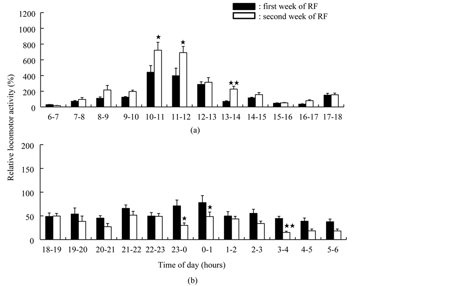 Figure 1. Averaged relative locomotor activities of rats subjected to RF of liquid meal (LM rats) during the light period (a) and dark period (b). Solid bars and open bars express the data of averaged relative locomotor activities in the first week of RF and second week of the RF, respectively. Data are expressed as means ± SE (n = 6). ★★p < 0.01 and ★p < 0.05 vs. the first week of RF.