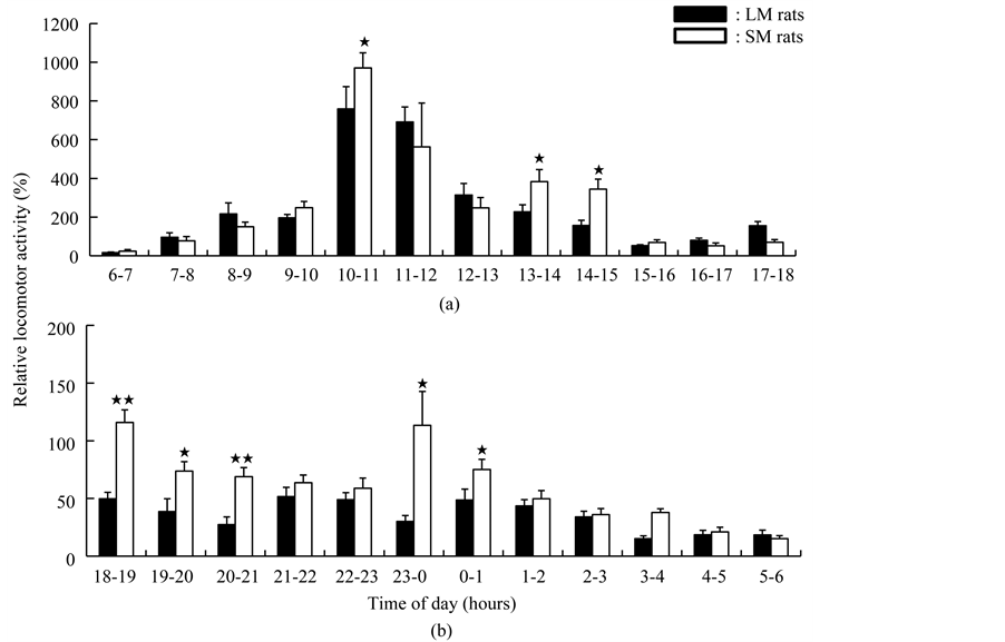 Figure 3. Averaged relative locomotor activities of LM rats and SM rats during the light period (a) and dark period (b) in the second week of RF. Solid bars and open bars express the data of averaged relative locomotor activities of LM rats and SM rats, respectively. Data are expressed as means ± SE (n = 6). ★★p < 0.01 and ★p < 0.05 vs. LM rats.