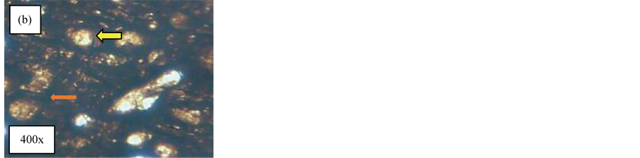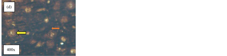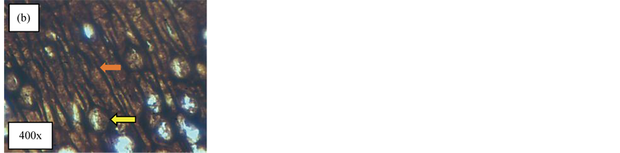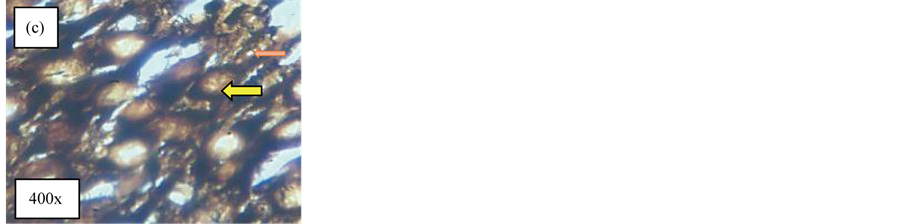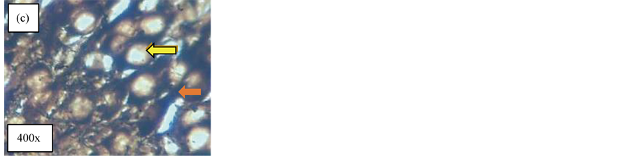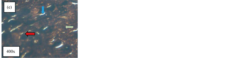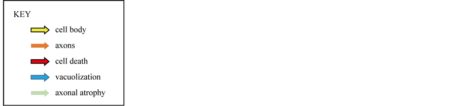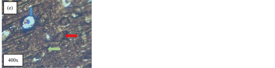 Figure 2(a) and Figure 2(b) show the frontal cortices of the female control rats. Figure 2(a) shows the general section of the female frontal cortex under low magnification while Figure 2(b) is a higher magnification of the same section which shows the cell bodies (yellow arrow) and axon (orange arrow). Figure 2(c) is a high magnification of treated group 1 which shows that there were no significant changes in the cell bodies and axons, shown by the yellow arrow and orange arrow respectively, compared to the control. Figure 2(d) shows a large number of thick axons in the treated group 2, indicating no axonal atrophy or significant changes compared with the control. Figure 2(e) is a high magnification of treated group 3 and shows cell death (red arrow), axonal atrophy (green arrow) and cytoplasmic vacuolization (blue arrow).