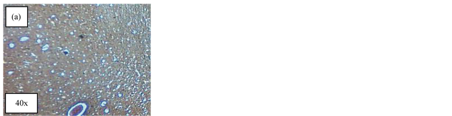 The tissues were processed in the Histology unit of the Anatomy Department at A.B.U., Zaria, Nigeria. The brain tissues were dehydrated in different grades of alcohol and cleared in xylene using an automatic processing machine (Shandon Southern Duplex Processor). The tissues were then infiltrated with paraffin wax and blocked in the coronal plane. Serial sections of the blocks were taken at 8µm with a (Leitz Wetzlar) microtome, mounted on glass slides and allowed to dry overnight. The staining technique employed was Glee’s ammonia silver impregnation method for neurons and degenerating axons in paraffin sections [14] . Sections were then observed under a light microscope (SERICO, China) at low and high magnifications and micrographs taken with the help of video camera eyepiece (DCE-1 or DN-200M, China). Sections of the frontal cortices were observed in each of the male and female treated rats and compared to the controls.
