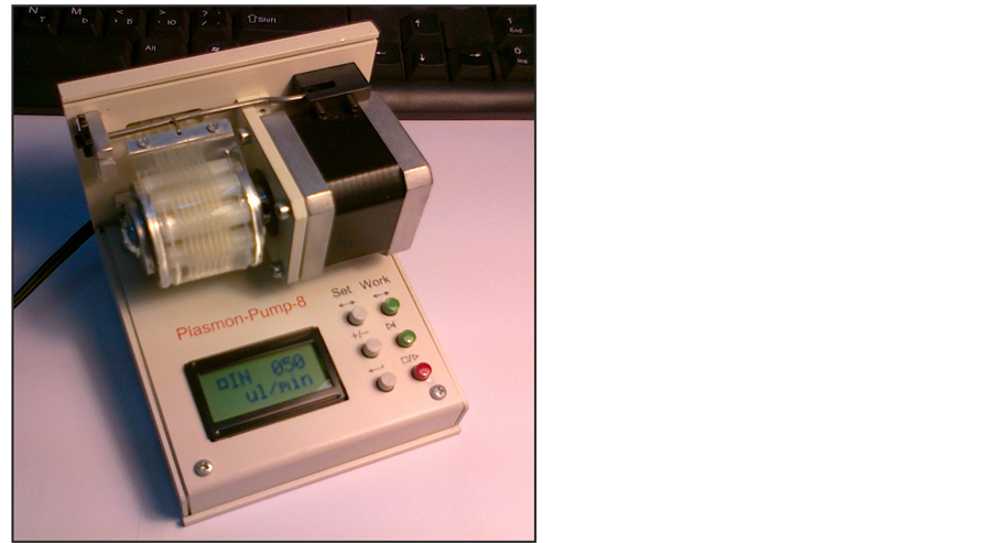 For investigation, we used two liquids with different refractive indexes: distilled water (n = 1.33154) and solution of potassium chloride (KCl) in water with different percentage from 2.5 to 20 percent. Substitution of liquid samples was provided with a peristaltic micro-pump (Figure 4). We fixed the change in the refractive index