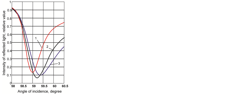 The sensitivity of SPR method is also defined by the width and shape of resonance curve, which define the accuracy of determining the position of its minimum. Therefore, one of possible ways to considerably increase (by several orders) the sensitivity of SPR sensors lies in narrowing the resonance spectrum. It can be attained using special diffraction or holographic structures on the sensitive area of sensors [7] . Narrowing the resonance spectrum can be also reached using bimetal layers “silver-gold” on the sensor surface [8] as well as by increasing the wavelength of laser radiation exciting SPR [9] .