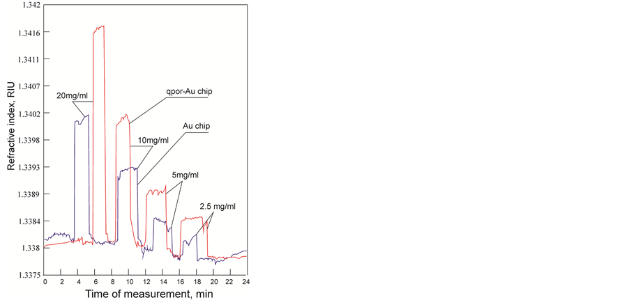 The kinetics of the SPR minimum shift was recorded using the special developed program. To decrease possible errors of measurements as a result of oscillations in the ambient temperature, the SPR refractometer “Plasmon-71” as well as flow cells with the studied liquids was placed into a thermostat kept at the temperature 22˚C ± 0.5˚C.