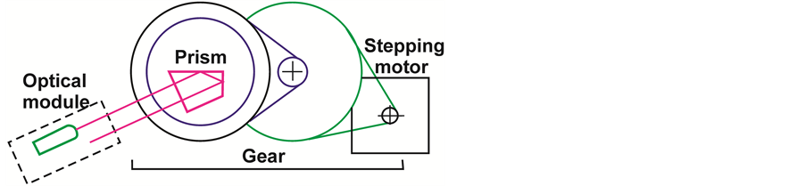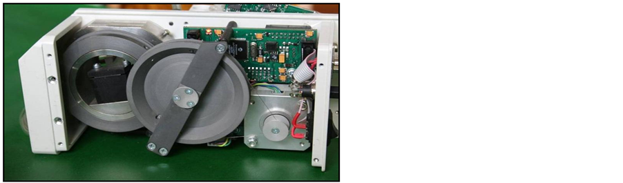As far as the design is concerned, the device is made as a mono-block structure consisting of the two bearing flat plates: the horizontal one and vertical rest, which are T-coupled with each other. The optical unit and measuring flow-cell with a prism are fixed on the one side of the rest, while the board of an electronic block for control and measurements as well as a step motor rotating the prism with a sensor is fixed on the other side of the rest. The optical unit and measuring flow-cell with a prism are depicted in Figure 2(b). The board of the electronic block for control and measurements as well as a step motor rotating the prism is depicted in Figure 2(c).