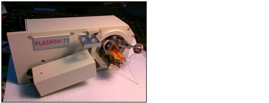 The influence of deposition geometry on the sensor sensitivity we studied in the refractometer “Plasmon-71” with laser wave length 850 nm and flow cell volume 70 micro liter. SPR refractometer “Plasmon-71” (Figure 2) developed at the V. E. Lashkaryov Institute of Semiconductor Physics under the National Academy of Sciences of Ukraine. The sensitivity of refractometer “Plasmon-71” was improved to 4 × 10−6 RIU. This device is capable of measuring one sample of the studied substance in an automated mode, displaying the obtained results on the monitor of a computer within 5 - 10 seconds. The optical scheme of the device is depicted in Figure 2(a). Its dimensions are 215 × 130 × 100 mm.