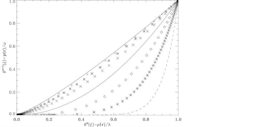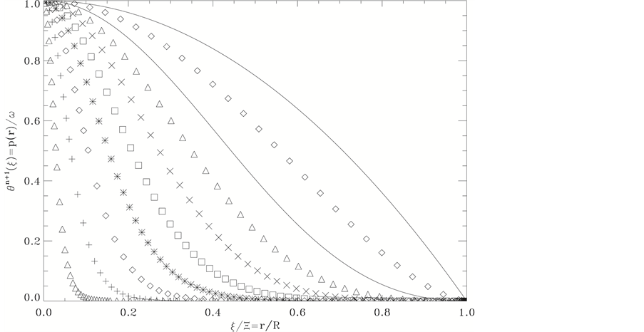 , keeping in mind the pressure, and then the density, has to be null on the boundary. Then a “vertical” inflection point of the reduced pressure profile takes place on the boundary. Accordingly, all reduced pressure profiles,