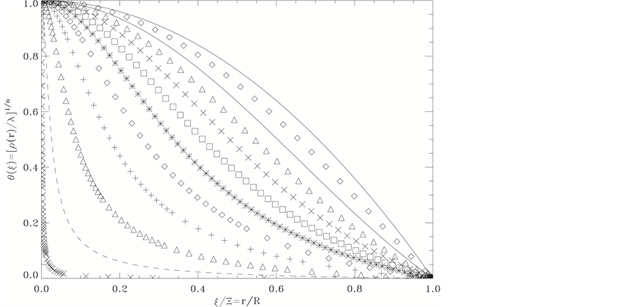central density. Reduced density profiles are plotted for several polytropic indexes within the range,