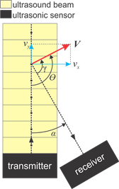 where fd8 is the Doppler frequency received by the piezoelectric element number 8 at angle α (measured clockwise from the axis of the transmitting beam), f0 is basic frequency, V is the magnitude of the velocity of the particle travelling at angle θ (measured clockwise from the axis of the transmitting beam), and c is the speed of sound in fluid i.e. water.