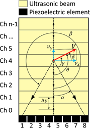 Phased Array UVP system is showed in Figure 4. National Instrument LabVIEW program is used to control Phased Array UVP system and reconstruct two-dimensional velocity vector. The measurement system consists of a 2 MHz phased array sensor with eight piezoelectric elements, 8-channel pulse receiver, analog to digital converter and personal computer to control the pulse receiver and analyze echo signal from the digitizer.