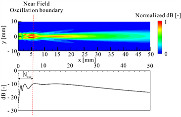 as shown in Figure 6. From the calculation, the near-field oscillation boundary is 5.78 mm from the element surface. Hamdani et al. [21] confirmed the near- field effect on the velocity measurement. Velocity data on the near-field region showed a bad accuracy. Nevertheless, the velocity data beyond the near field showed a good agreement with conventional UVP, and they confirmed that the angle uncertainty for two-dimensional velocity was ±1˚.