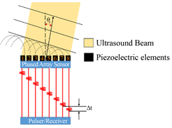 In this paper, phased array sensor is used as transmitter and receiver (transceiver). As shown in Figure 3, the number of piezoelectric elements is eight elements. These eight elements transceiver transmit ultrasound beam at the same time or delayed for certain time to get steering angle, then the beams from these transceivers will interference pattern forming (beamforming) into one beam.