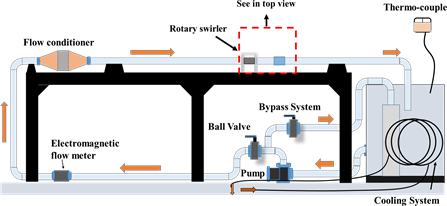 The experiment was conducted in a horizontal water circulation system at atmospheric pressure, which consisting of the cooling system, electromagnetic flow meter, pump, ball valve, a bypass pipe, and flow conditioner as shown in Figure 7. Water is supplied to the test channel from the water storage tank by a 3 phase induction motor pump (65 × 50 FSED EBARA CORPORATION). The flow rate of the liquid phase is controlled using the control ball valve. The flow rate is measured by magnetic flow meter (MAGMAX MGC010 Tokyo Keiso Co., Ltd.) with accuracy ±0.5%. Fluid enters the straight pipe test section after an elbow. Therefore a flow conditioner is installed to eliminate the flow distortion