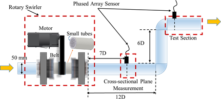 The swirl generator is installed at 12D upstream of the double bent pipe. The rotary swirler consists of a 150 mm long aluminum pipe with inner diameter 50