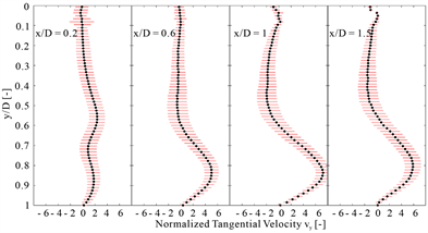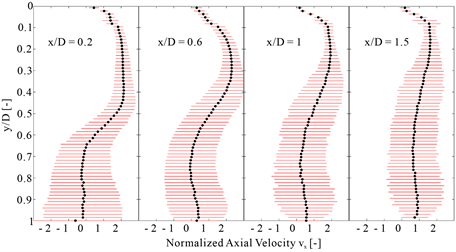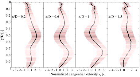 Figure 12 shows the one-dimensional time-average axial velocity with their standard deviations downstream of the double bend pipe with inlet swirling flow condition (S = 1). In the case without and with inlet swirling flow condition, at each axial measurement positions, there is no significant difference on the velocity profiles in the main flow region (0 < y/D < 0.7). However, in case of with swirling flow, the velocity magnitude in the secondary flow region (0.7 < y/D < 1) is stronger than without inlet swirling flow condition. These differences are due to the inlet swirling flow enhance the centrifugal force on the curvature bend. Figure 13 shows the one-dimensional time-average tangential velocity profile of inlet swirling flow with their standard deviations. The strong tangential velocity occurs at x/D = 0.6 and x/D = 1 because the swirling enhance the tangential velocity in the main flow region (0.1 < y/D < 0.4) and the secondary flow region (0.7 < y/D < 1). These results indicate that tangential velocity in swirling flow is more dominant on main flow regime than without swirling flow condition. According to the standard deviation, the tangential velocity fluctuation in the inlet swirling condition is higher than without inlet swirling flow. It means that the inlet swirling flow also increases the tangential velocity fluctuation.