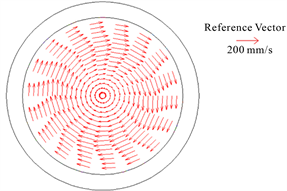Firstly, to confirm the inlet swirling condition, we visualized two-dimensional radial velocity as shown in Figure 15. The measurement is taken at 7D