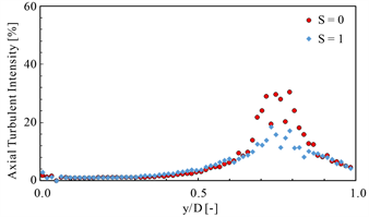 Figure 17. Comparison of the axial velocity fluctuation between with and without inlet swirling flow.