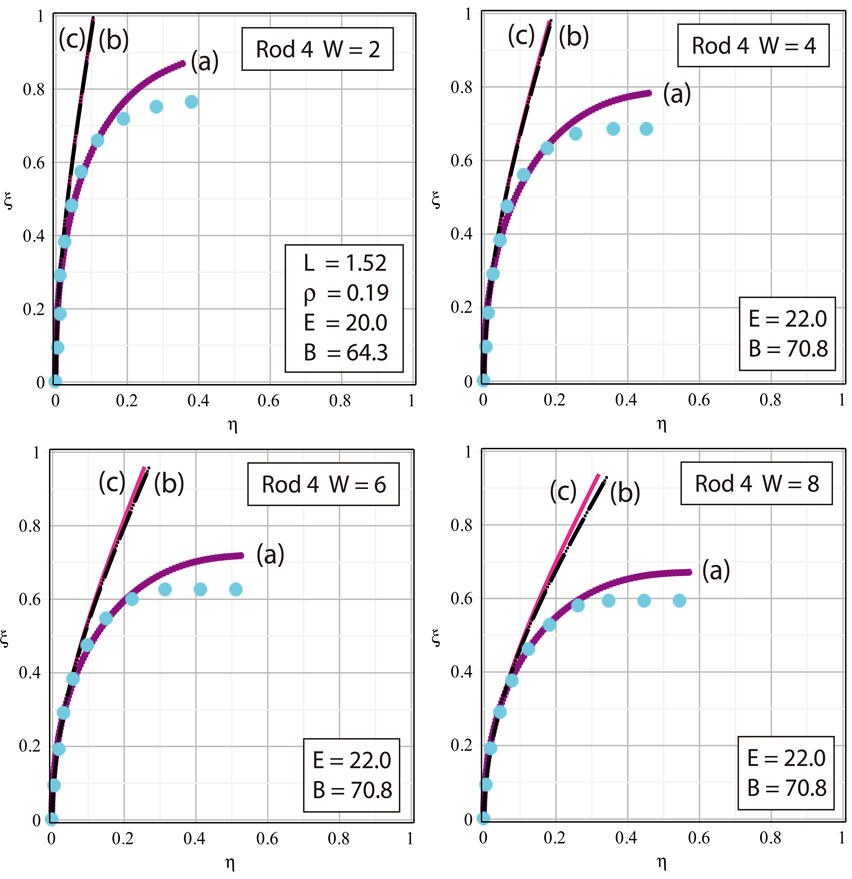 A comparison of theoretical and experimental deflection curves for Rods 1 through 5 is shown graphically in Figures 8-12 respectively. Each figure comprises four panels corresponding to each of the four impressed loads (W = 2, 4, 6, 8 pounds). Within each panel, the solid wine-colored curve is the theoretically predicted elastica curve obtained by solving Equation (13), given the known geometry of the rod, the load, and the initially unknown elastic modulus E. Values for E were determined by trial and inspection of the resulting match with the experimental curve marked by blue solid-circle plotting symbols at points where the image-analysis software was instructed to determine coordinates. For purposes of comparison, the exact deflection curve of the corresponding uniform rod (dashed black curve) and the Euler-Bernoulli approximate deflection curve of correct total arc length (solid pink curve) are also shown in each panel.