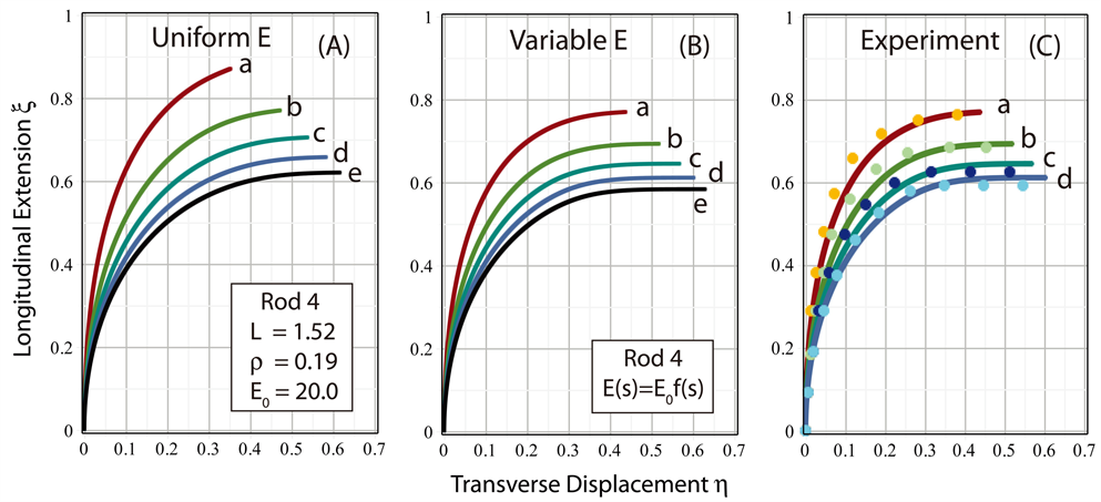 We can account quantitatively for the observed features of Rod 5 by the same model as for Rod 4, but with different parameters. Fitting the exact theoretical calculations to the data by trial and inspection yielded a stiffness enhancement factor , and partition location , which gave very satisfactory results, as seen in Figure 14. Panel A of the figure shows the deflection curves (solid) as calculated exactly by Equation (13) with model (47) for the partitioned modulus, and the corresponding deflection curves (dotted) for the rod with uniform modulus. Panel B shows the agreement (plots a and b) between the partitioned-modulus model and the deflection curves of Figure 12 measured for