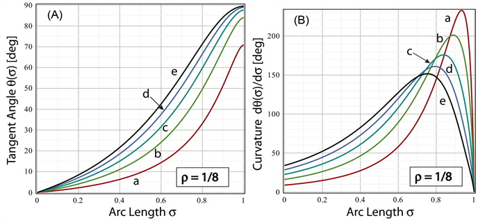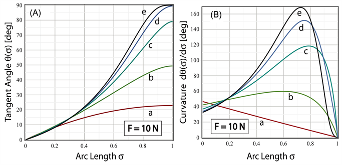 Examples of graphical solutions generated from command (18) are shown in Figure 3 and Figure 4. Figure 3 shows in Panel A the graphical output vs for a rod characterized by , , , , and a sequence of loads ranging from 2 N to 10 N. As the load increases―i.e. plots range from a to e―the slope at the tip increases from about 70˚ to 90˚. Panel B shows the corresponding variation in curvature for the same sequence of increasing loads. With greater load, the flex point―point of greatest curvature―shifts to lower arc lengths, i.e. closer to the base of the rod.