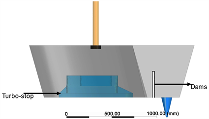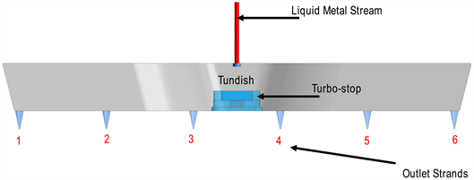 The 3-D design of Tundish is as shown in Figure 1(b). It is a six strand Tundish with a turbo stop just beneath the inlet to control turbulence.