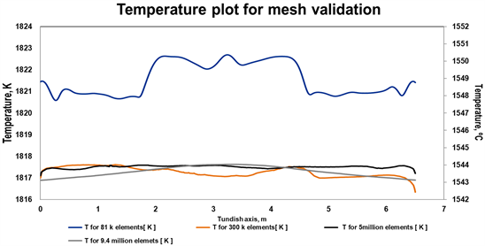 Table 2 shows the temperature and velocity at outlet number 3 for the above four meshes. Figure 3 shows the temperature value on a line passing through the cross-section of the Tundish along X axis (6.34 m domain). The difference in average results for velocity at outlet 3 for 81,470 elements and 9,466,023 elements is about 10% while the difference in the results for 5,076,362 elements and 9,466,023 elements is about 1%. Therefore, in the present study, the 3-D computational grid having 5,076,362 has been considered.