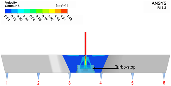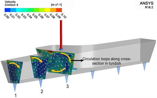 • Due to special curved design near inlet, high surface velocity regions directed towards long side wall away from strand outlets are found. This may lead to heavy erosion of Tundish refractory in the top region of rear wall area.