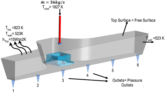 For the heat transfer calculation, the boundary conditions include the incoming liquid steel temperature as 1823 K. The heat losses were supposed to be taking place through the walls, bottom and free surface of fluid in the Tundish. The heat transfer coefficient at the top surface is taken as 15 W/m2K and for Tundish walls heat transfer coefficient is taken as 3.46 W/m2K [9] . The higher heat transfer at top surface is due to extra radiative heat transfer taking place as compared to walls of Tundish where only conductive heat transfer happens.