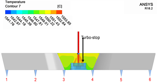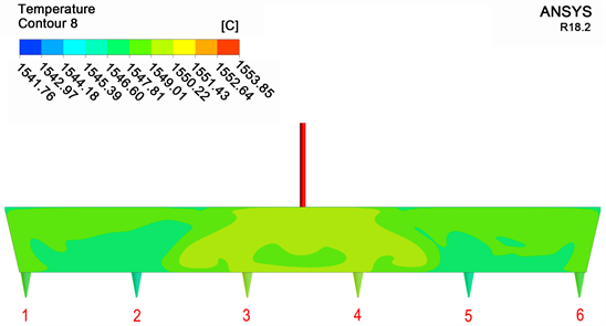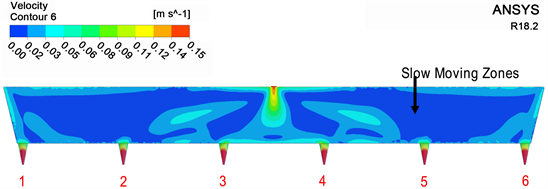Figure 7(a) and Figure 7(b) show temperature distributions on two planes along the width passing through inlet and all the outlets, respectively. Overall, a maximum drop of temperature in the Tundish is about 10˚C. To compare temperature at different strands, the temperatures at all six strand outlets are shown in Figure 8 with respect to inlet temperature. As expected the farthest strand has highest temperature drop. Higher temperature is achieved in the nearest strands from the inlet. Predominantly two factors are responsible for this large temperature drop in the outer strands: first one is presence of numerous slow moving zones and seconds one is higher residence time. However, comparing nearest to the farthest strands regarding temperature drop, there is a minimal difference of 2˚C in the temperature.
