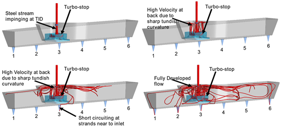 streamline paths that there are heavy recirculation zones near inlet due to special curved refractory design near the inlet part. Based on streamline, a fair judgment can be done on short circuiting, see Figure 6(b) and Figure 6(c). It is obvious