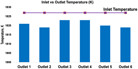 Figure 8. Comparison of Inlet temperature to outlet temperatures of strands for 6 strands Tundish all strands functional.