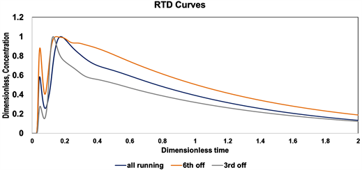 Figure 9. RTD curves for different strand operational on dimensionless concentration with dimensionless time.