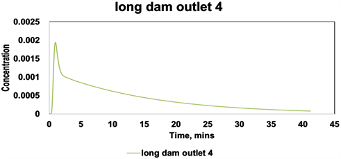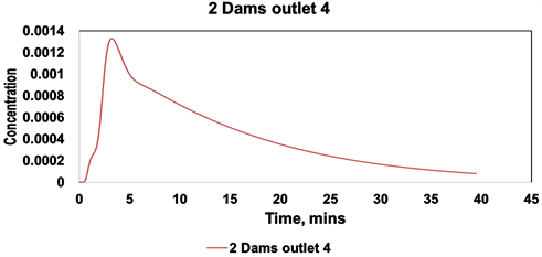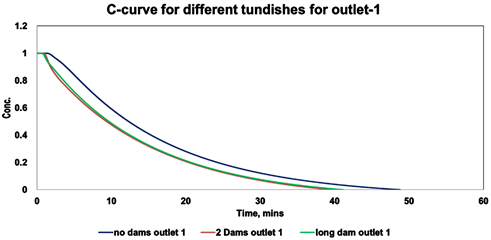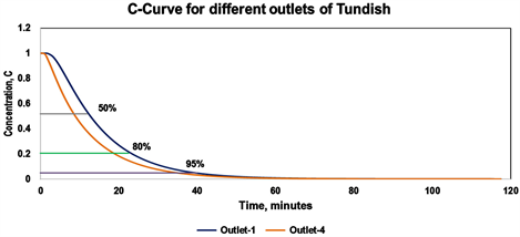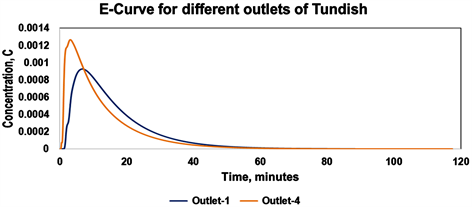 As mentioned above, the tracer is tracked on the frozen flow field till most of the injected tracer leaves the Tundish via strands/outlets. For each strand/outlet, the concentration variation of the species is tracked with respect to time. This history of concentration variation with respect to time is called RTD (Residence time distribution) curve. In general, aRTD curve is a characteristic function of continuous process system and provides information on malfunction(s) if any and flow pattern i.e. degree of mixing [2] [8] [15] [18] .