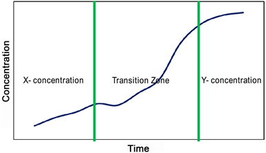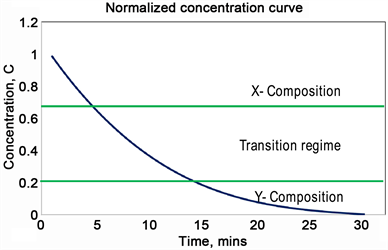 In general, Tundish is a combination of plug flow reactor (PFR) and Continuously stirred tank reactor (CSTR) [14] [15] [16] . During sequence change of the casting, grade change leads to mixing of grades which may be undesirable for critical grades. Grade change leading to transition can be explained as follows, suppose a grade with “x” Composition (Chemistry) is being casted and after a certain time the other grade with Composition “y” is poured in the Tundish with (y > x) [3] . A general picture regarding concentration variation at a strand (outlet from Tundish to inlet of mould) with time can be plotted as shown in Figure 2(a). The concentration plot can be made dimensionless using Equation (1), as shown in Figure 2(b).