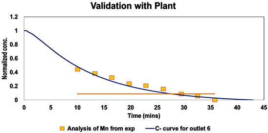 To get the confidence in the grade transition model, a plant trial was executed. The trial casting conditions and grade composition are shown in Table 5 and Table 6. In the trial, all the strands were functional and average casting speed was in range of 2.71 m/min. Strand 6 was chosen for sampling of billets to track the chemistry variation of elements [C, Mn, Si] with respect to casting time. Nine billet samples were collected from the strand 6 at different time intervals after the Grade 2 ladle was opened to be poured into the Tundish. Table 7 shows the variation of Mn, Si and C concentration (both normalized and non-normalized) with respect to casting time. As it is evident from Table 7 that the critical element for the trial sequence is Mn since the transition of Mn is slowest among all elements. The normalized concentrations obtained from both CFD and plant is compared as shown in Figure 11. The transition time to achieve 92% of