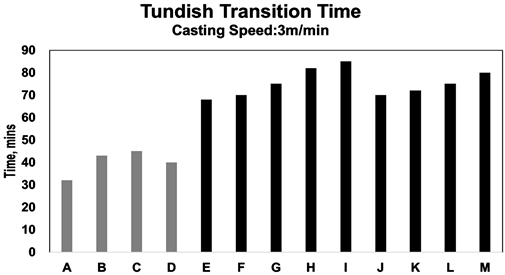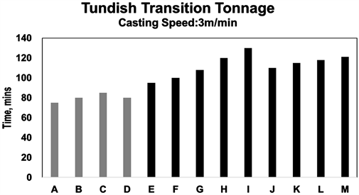 Note that the casting speed and the weight of the steel in Tundish are based on real plant scenario. The transition tonnage is calculated as follows: