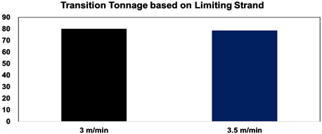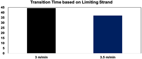 A pertinent question is that whether at different casting speed, the transition time and tonnage will be different. To answer this, transition tonnage and time is computed for two casting speeds, 3 and 3.5 m/min for all strand working scenario. Figure 13 shows a comparison of transition time and tonnage based on limiting strand (strand 1 and 6 farthest). As evident that the increase in casting speed from 3 to 3.5 m/min decreases the transition time from 44.3 to 37 minutes, while change in transition tonnage is insignificant (80.1 to 78.5 tons). For