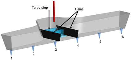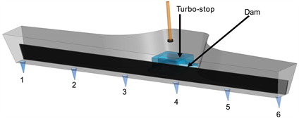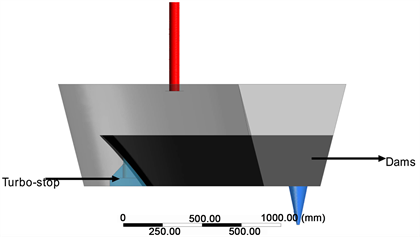 There is always an emphasis to decrease the intermixed quantity. One of the methods is to provide special baffles. To study the impact of baffles on the transition tonnage, here two types of design of baffles for six strands Tundish have been performed. The two designs are shown in Figure 14 (say design 1) and Figure 15 (say design 2) respectively. The Design 1 (Figure 15) presents a design of Tundish, in which two dams are placed across the width of Tundish adjacent to the turbo-stop. The Design 2 (Figure 16) presents the design of Tundish in which a single long dam is made between inlet and outlet, the dam is placed just in front of the turbo-stop. The height of the dam is taken to be half height of Tundish height. Both the new designs were simulated for the same casting speed of 3.1 m/min.
