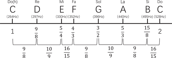 From middle C (doh) by piling up , we get G (sol), then , which is D (re). The next is , which is A (la) with frequency 440 Hz. The 5th is , which is E (mi).
