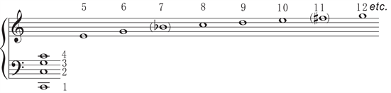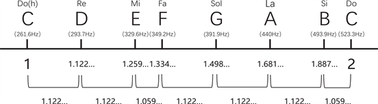 Since one whole-tone consists of two semi-tones and there are two semi-tones and five whole-tones in one octave, it follows that one octave has 12 semitones, cf. (8.6) below. Therefore, piling up the notes on the basic one, the 12th power is