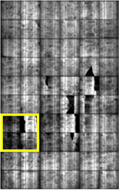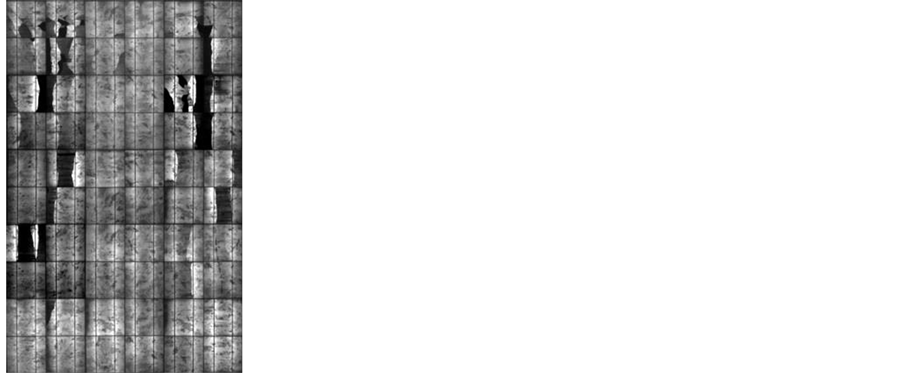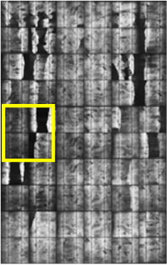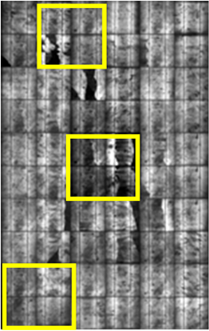 tests were 8.38%, 11.36% and 9.54%, respectively. All snail trail modules decreased power within 2% during testing period and no discolored areas enlarged by our visual inspection. In here we can speculate the reactants such as EVA excessive antioxidant or peroxide exhausted and no further discoloration. A special phenomenon was observation in our long term 3000 hours damp heat test which original snail trails were disappearance (pictures here not shown) it like reversed process [10] . In Figure 4 the EL images showed cells micro cracks did not enlarge and no new micro defects were formed in the PV modules during the accelerated aging tests. From EL images showed little darken at former crack areas after these tests as shown in Figure 4(b), Figure 4(d) and Figure 4(f) yellow squares. There were corrosion formations to increase series resistance. In our results showed the power loss not serious after these accelerated aging tests. But not warranty the module performance correlated with cell cracks in the future. The cell cracks defects would need to be checked more detail to assure the PV module lifetime in future 25 years.