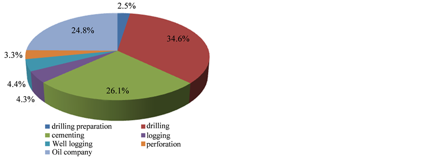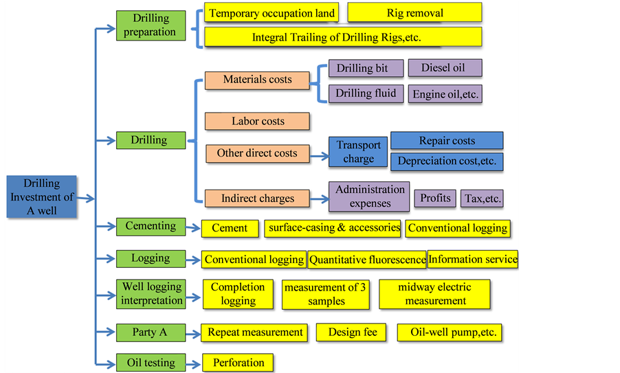 The common drilling cost includes the investment of all the projects from drilling preparation to the end of well testing and installment of production tree at last. These projects include six major projects, such as drilling preparation, well drilling, cementing, logging, well logging interpretation and well testing. There are more than forty kinds of cost in different production stages of these six major projects (Figure 1).
