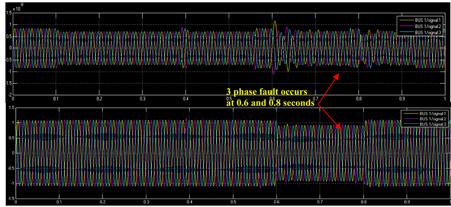and load points which are added and removed to specific busses during the simulation period. There are several conditions such as fault types, topology, generation, and load changes) introduced into the IEEE test system. The colored blocks in Figure 1 aid in simulating the above conditions. Figure 2 represents the voltage and current waveforms at bus 1. The simulation model is tested, and ran for a 1 second period with a sampling period of 0.02. The top section of the scope in Figure 2 represents the voltage in p.u. versus time while the bottom of the scope shows the current versus time. The unsymmetrical waveforms are the result of settings in the system. Table 1 displays the measured values at bus 1.