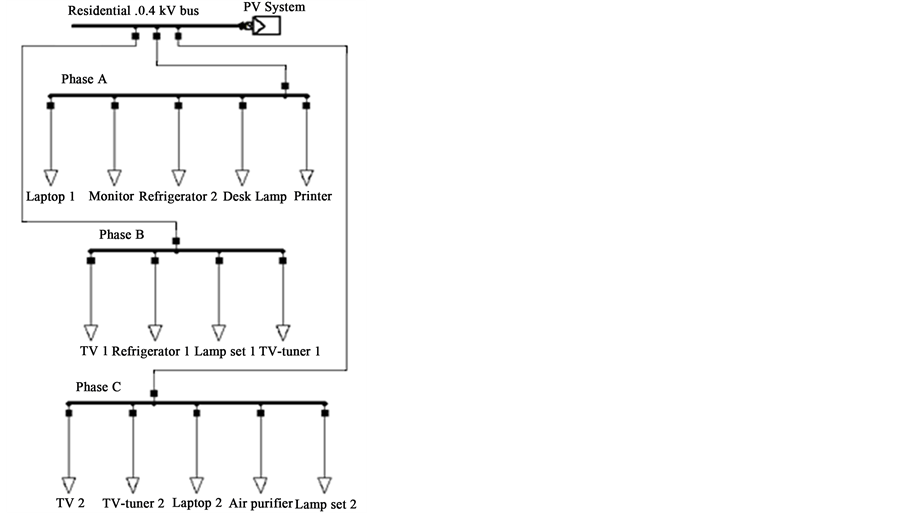 The residential distribution network and loads for assessing load flow were modelled using DIgSILENT Power Factory software. The model consisted of a three-phase residential load at 0.4 kV voltage level composed of different single phase loads. The schematic of the residential load model is presented in Figure 1.